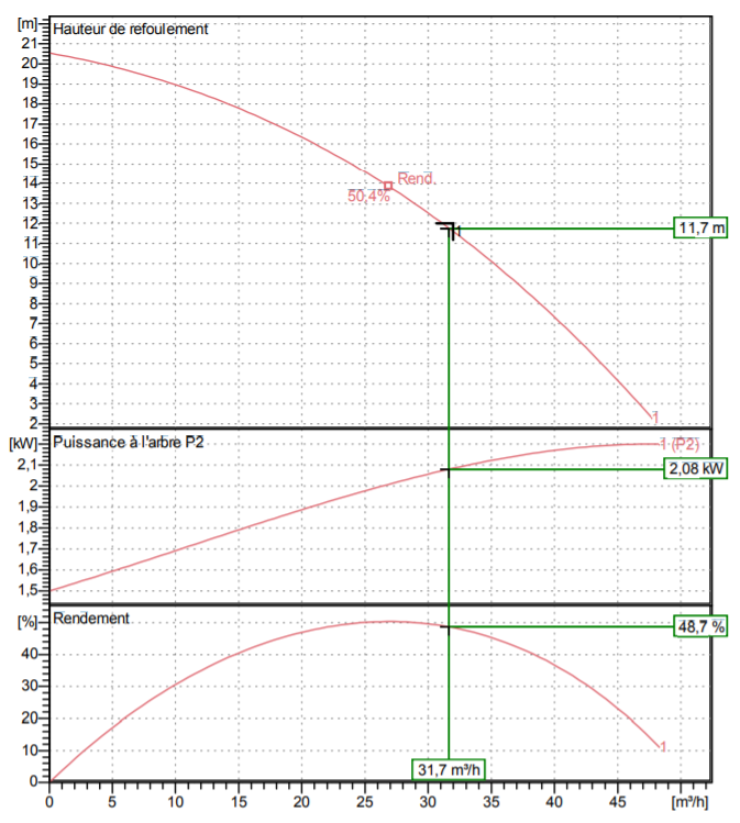 | Point de fonctionnement nominal | 11,7 m 31,7 m3/h |